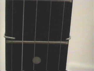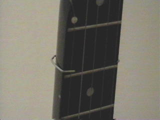 I spent about 10 minutes the other day reconstructing a home-made 5th-string capo that I had originally made back in the 60's. It's a little hard to describe, but with the above pictures it should be reasonably understandable. I made it from nothing more than a paper clip!! (The larger of the 2 common sizes) -- I first straightened it by hand, then, using a pair of needle-nose pliers, I bent one end at a 90 degree angle -- just long enough to come over the edge of the neck and cover the 5th string. Then, I (by hand) bent the rest of the clip to approximate the curve of the back of the neck, leaving the other end sticking up way beyond the fingerboard by the 1st string. Note that the wire is not completely in contact with the neck all the way around. This allows for some springyness, which is what holds the capo in place. I pressed the wire in as tight as possible, to conform to the shape of the neck, and then bent the other end (1st-string side) over the edge of the fingerboard. Then, using the needle-nose pliers again, I bent that end up very (very very) slightly, just a tiny bit in from the edge, (in the picture, you can see just the hint of an upturn) and then cut the wire right at that bend. This end is very short and the upward lift is almost undetectable. The end has to be small enough so that it doesn't interfere with playing the 1st string. The purpose of the slight upward bend is to facilitate sliding it around the neck without scratching. I filed both ends smooth and slightly rounded. Bill Palmer suggested covering the wire with a piece of "spaghetti" insulation to prevent it from indenting the back of the neck. As I recall, my original capo (~35 years ago) did indent the back of the neck slightly if left in place for long periods of time (days or weeks). This should eliminate the problem. To use this capo, all I do is place the flat end over the 5th string and slide the other end around the neck, catching the tiny end over the 1st-string edge of the fingerboard. It took a little experimenting to get the shape and length right (it actually took me 2 paper clips), but even with all that waste it's still rather inexpensive. The total time involved, including going down to the basement to find my pliers and a file, was less than 10 minutes.